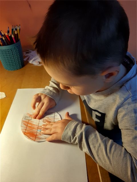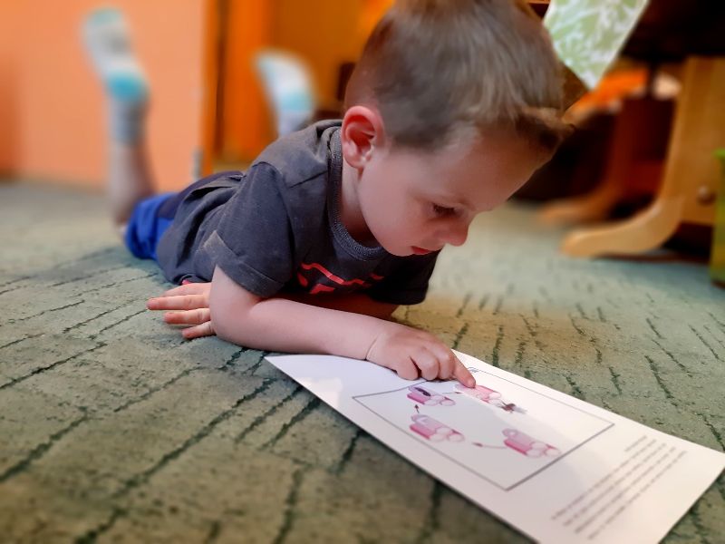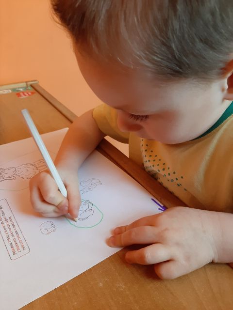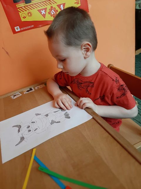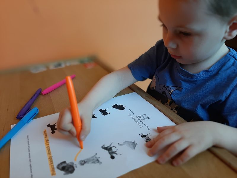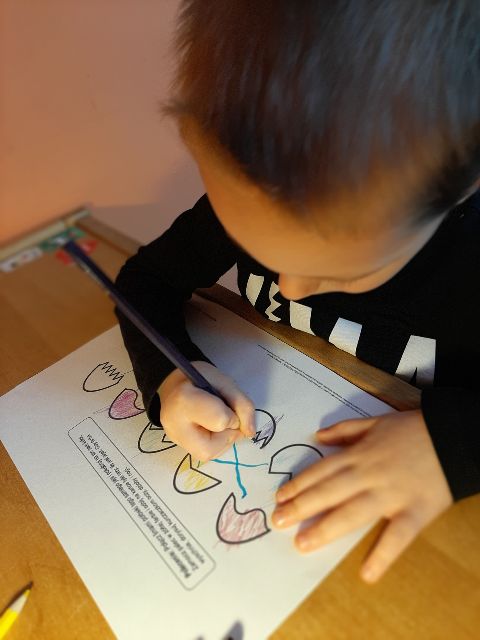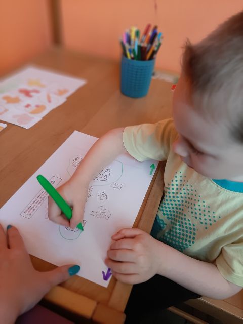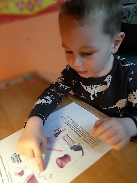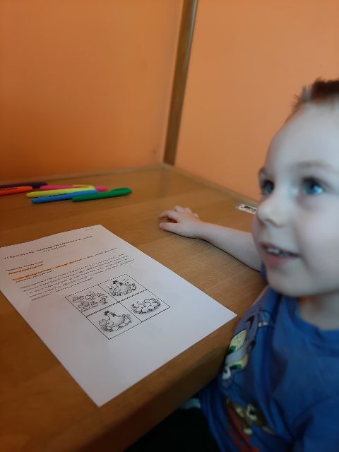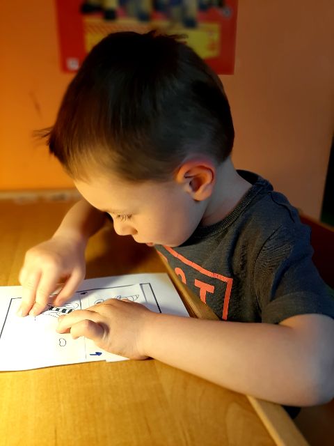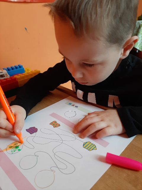 Jaś podczas wykonywania balonikowej karty pracy