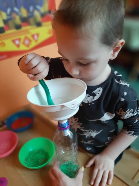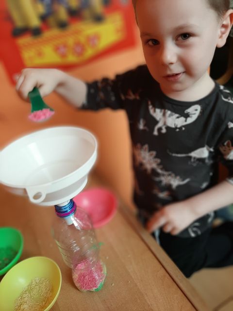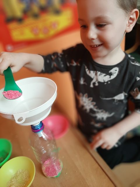 A może odrobina różowego...? - Jaś podczas zabaw z kolorowym ryżem