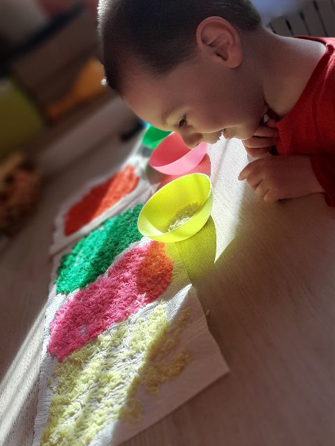 Jaś podczas zabaw z kolorowym ryżem