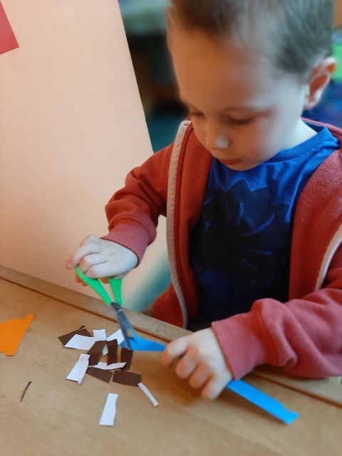 Przed rozpoczęciem kolejnej pracy, Jaś musi przygotować sobie materiał - kręci kuleczki z bibuły
