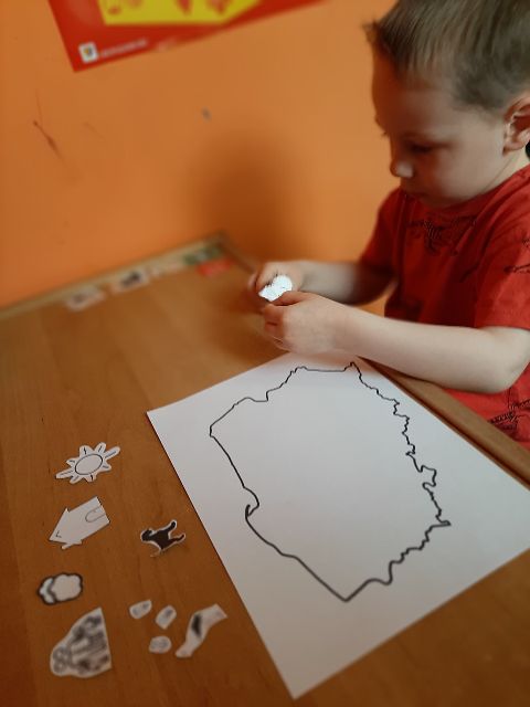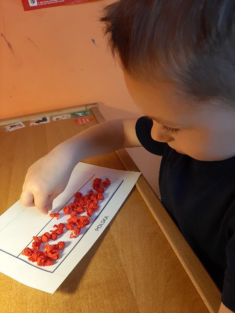 Następnie Jaś je nakleja na flagę, pamiętając, że kolor czerwony jest na dole