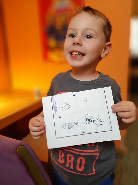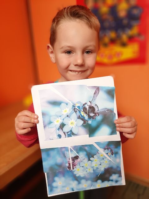 Jaś ustala w jakiej kolejności ułożyć obrazki "Rozwój pszczoły"
