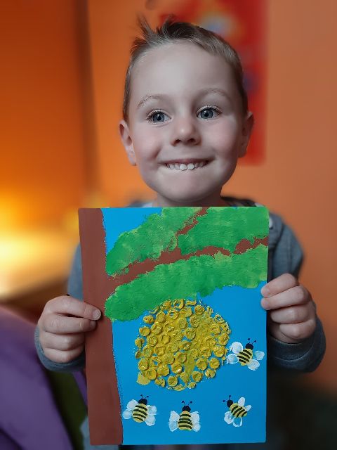 Jaś wykonał wesolutką pszczółkę na plastrze miodu