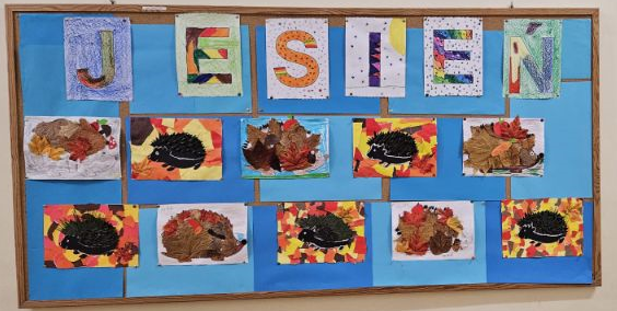 Przez cały tydzień uczniowie klas II a, II b, III a i IV a dalej poznawali zalety jesieni. Czytaliśmy wiersze o tematyce jesiennej, obserwowaliśmy zmiany zachodzące w przyrodzie. Wszystko to zainspirowało dzieci do zrobienia wspaniałych prac plastycznych. Głównym bohaterem został jeż, który zbiera dary jesieni. Do prac wykorzystano różne materiały: zasuszone kolorowe liście, pestki słonecznika, igły z sosny. Świetlicowa tablica rozbłysła bogactwem jesiennych kolorów.