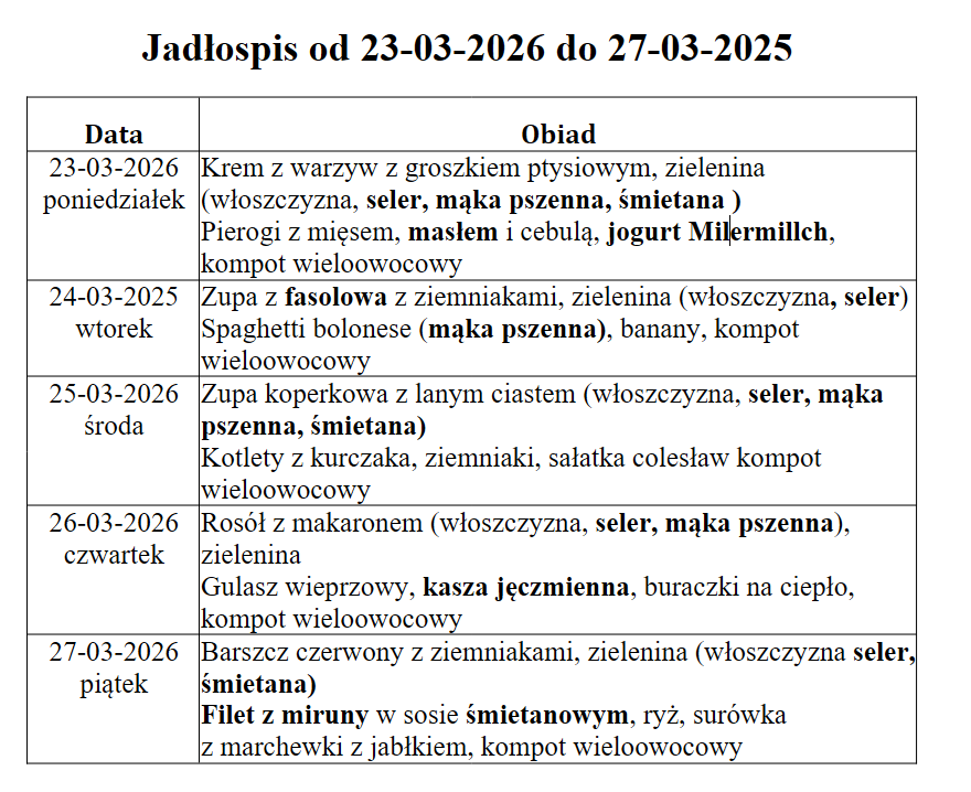 W niniejszym jadłospisie wyróżniono substancje lub produkty powodujące alergie lub reakcje nietolerancji zgodnie z załącznikiem II do Rozporządzenia Parlamentu Europejskiego i Rady (UE) nr 1169/2011 z dnia 25 października 2011r.