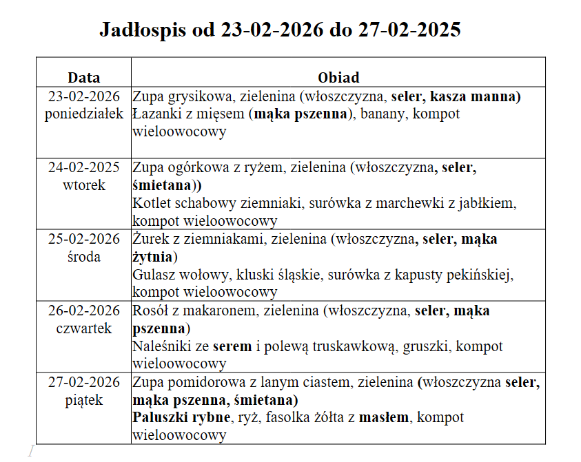 W niniejszym jadłospisie wyróżniono substancje lub produkty powodujące alergie lub reakcje nietolerancji zgodnie z załącznikiem II do Rozporządzenia Parlamentu Europejskiego i Rady (UE) nr 1169/2011 z dnia 25 października 2011r.